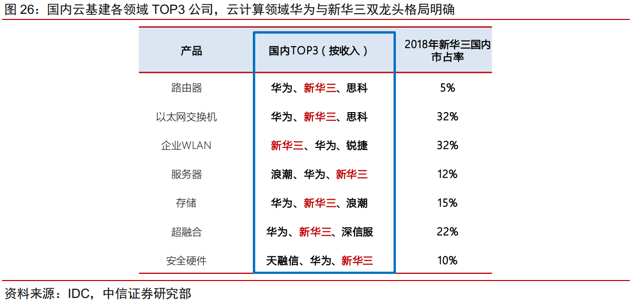 云计算基础设施为“云计算七件套”:路由器、交换机、WLAN、服务器、存储、超融合、安全硬件。新华三在路由器排名第2、交换机排名第2、企业WLAN排名第1、服务器排名第3、存储排名第2、超融合排名第2、安全硬件排名第3,国内唯有华为和新华三两家企业在每个领域均为第1、第2或第3。