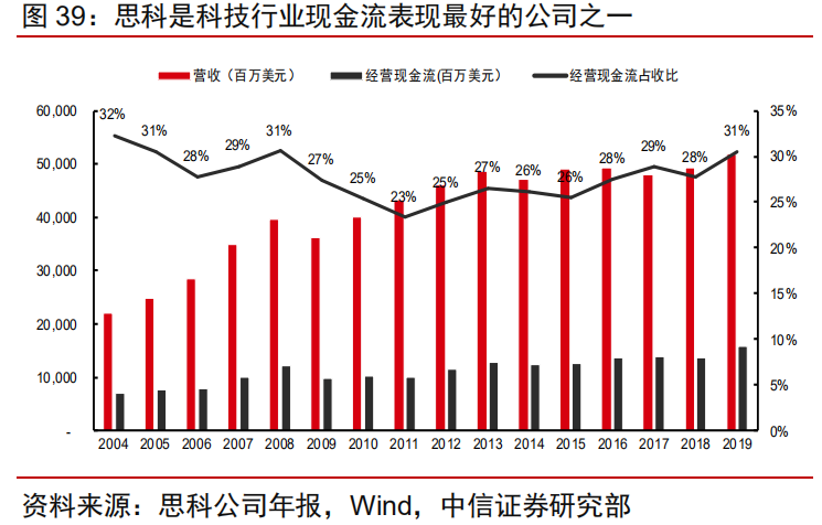 思科是典型的现金牛公司,步入成熟期后大规模股票回购、积极分红回报投资者,是追求长期表现的投资者的最佳科技股之一。思科自由现金流从2011年89亿美元提升至2019年149亿;2019年,公司86%的现金用于股票回购和分红(67%用于股票回购,19%用于分红)。