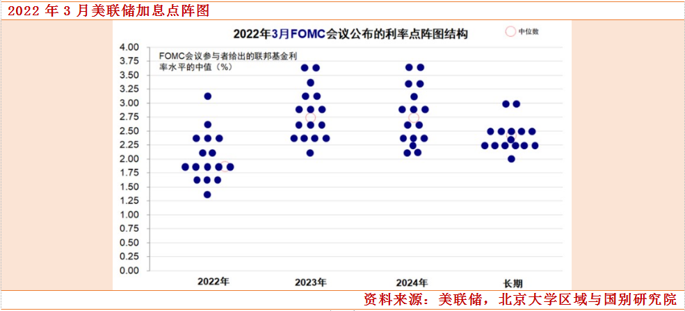 美国经济过热:通胀高企与劳动力市场紧张,美联储不得不加快收紧货币政策。2022年3月中旬,美联储宣布加息25个基点。此外,美联储主席鲍威尔不断释放鹰派表态称将在今年余下的六次议息会议上均加息25个基点,甚至不排斥一次会议加息超过25个基点,如果按照如此加息路径意味着2022年年底联邦基金利率将会达到1.75-2.0%。此外,美联储还将考虑在今年特定时期开始缩表。