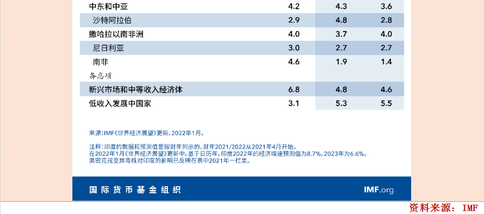 IMF在最新一期《世界经济展望》中预测,2022年全球经济增速为4.4%,比2021年10月时的预测低0.5个百分点,这主要受到供给扰动、通胀上升、债务激增、不确定性增加的影响。