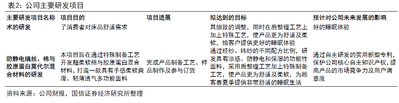 研报菌简评:公司投入金额和占比在行业内均较为领先,研发费用率仅次于收入规模较小的梦洁股份(2022年为3.7%);高于罗莱生活(2.1%)和水星家纺(2.0%)。