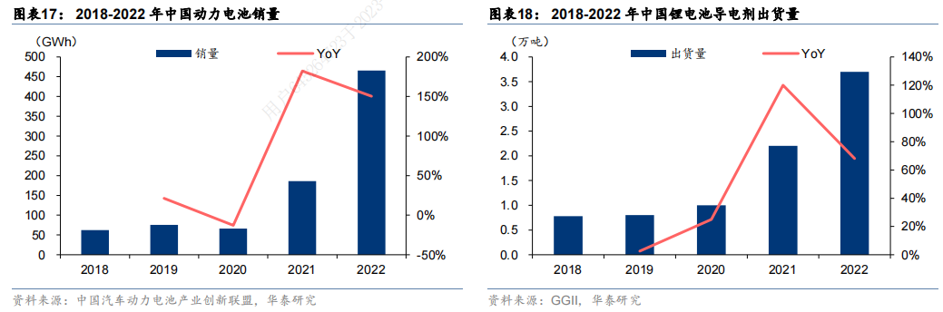 近年来,受益于锂电池市场需求高增,电池材料出货量快速提升。根据中国汽车动力电池产业创新联盟数据,2022年中国动力电池销量达465.5GWh,同比增长150%。导电剂作为关键辅材之一,也实现了快速增长,根据GGII数据,2022年中国锂离子电池导电剂出货量为3.7万吨,同比增长68%。