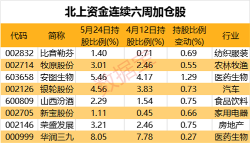 北上资金连续六周加仓8股