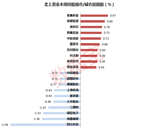 北上资金本周增仓了522股。具体来看,紫鑫药业获加仓0.97个百分点,加仓比例最高。其次是美都能源、海利尔及顺鑫农业等4股,加仓比例超过0.7个百分点。康恩贝、顾家家居、立思辰等股增仓也较明显。