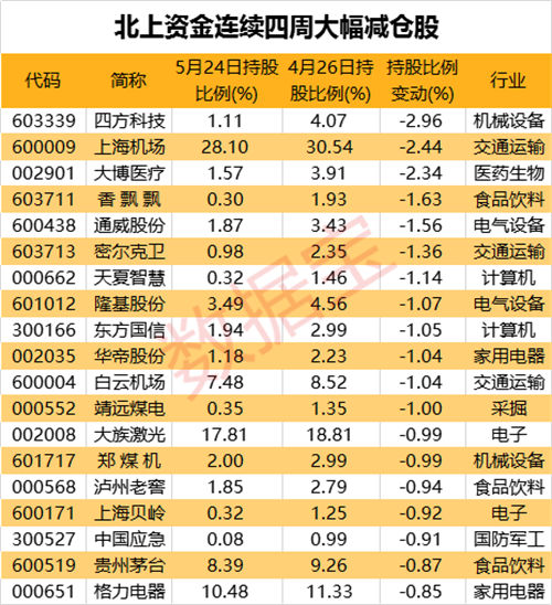 从持股比例变动来看,与四周前相比,12股减仓超1个百分点。四方科技、上海机场、大博医疗位居净卖出前三名,3股持股比例下降均超过2个百分点。香飘飘持股数量由四周前的89.41万股降至13.92万股,数量下降超80%,持股比例下降1.63个百分点;通威股份最新持股比例也下降了1.56个百分点。