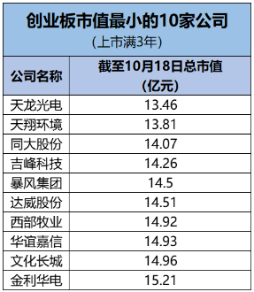 另外,随着重组新规的落地实施,短期创业板壳资源概念有望受到资金的青睐,可以从市值较小叠加主业相对低迷的角度挖掘,以下是上市满3年且市值最小10家创业板公司名单: