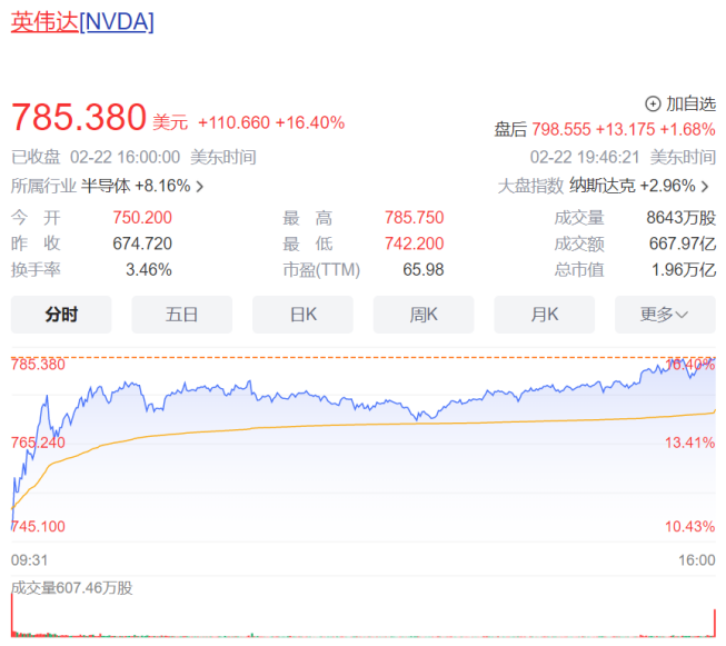 英伟达收涨16.40%,股价报785.38美元,市值单日增加了2770亿美元,打破了Meta月初创下的纪录。目前,英伟达总市值达到1.939万亿美元,超过了谷歌和亚马逊,重回美股市值榜第三、全球市值榜第四的位置。