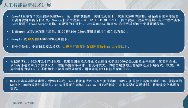 扎克伯格在2024年1月对外称,Meta正在构建大规模算力基础设施,到2024年底集成35万张英伟达H100,将拥有近60万个H100的等效计算量。外界估算,Meta购买这些芯片至少需要90亿美元。