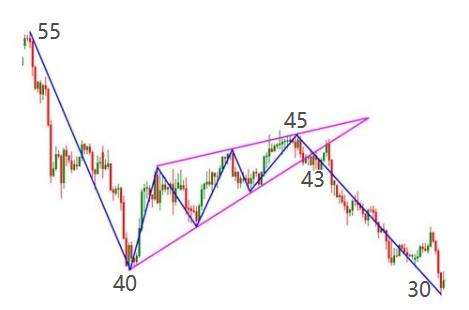 上图为下跌中继形态,是上涨中继形态的反向,这个就不太适用于股市中的止盈,但适合做一些期货或贵金属的做空交易,道理和上涨中继形态相似。做空时的最佳卖点为突破颈线的43元,止盈点设为x,55-40=45-x,x=30,则止盈点设在30元附近。