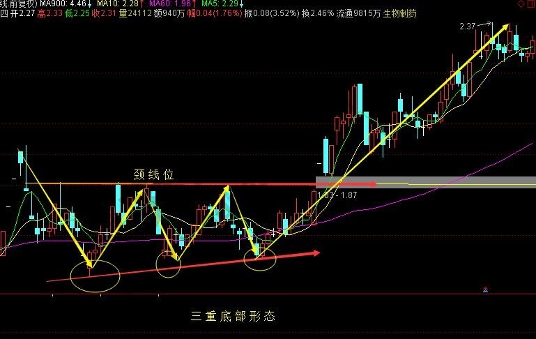 最后,给大家留一个思考题,下图为生物制药的三重底反转形态,你认为恰当的止盈点有几个,分别在哪里呢?