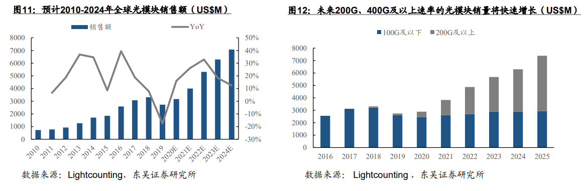其中,亚马逊和谷歌在2020年开始引领了对于400G光模块的需求,Facebook在2020年底部署200G光模块的计划可能会推迟到2021年。阿里巴巴和中国其他云服务公司也有望在2021年之后开始部署200G与400G光学系统。