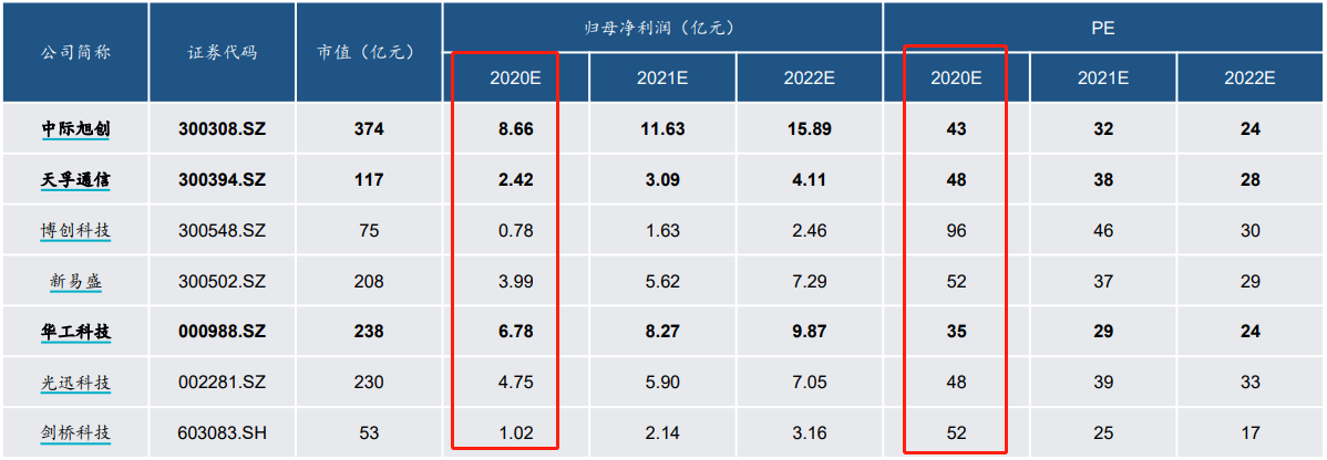 光模块主要7家公司业绩与估值情况: