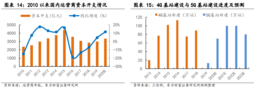 根据运营商公布的数据来看,2020 年规划的资本开支为 3348 亿元,将实现同比增长 11.65%,可以确 定运营商资本开支将在 5G 建设周期内重回上升轨道,以 4G 网络建设期作为参考,资本开支还将有 3-4 年的上升期。