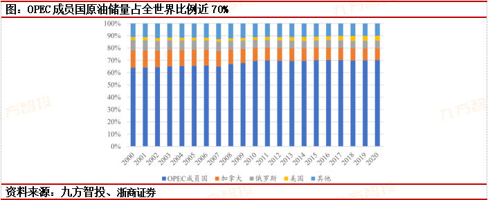 供给端,全球原油储量及产量均高度集中。OPEC成员国已探明原油储量占全球近70%,原油产量占全球近40%,基本主导了全球原油供应,对原油价格的影响力较强。而近年来,伴随美国页岩油革命爆发,美国在全球原油产量中的占比迅速提升至16%左右,亦成为原油供给的重要来源之一。