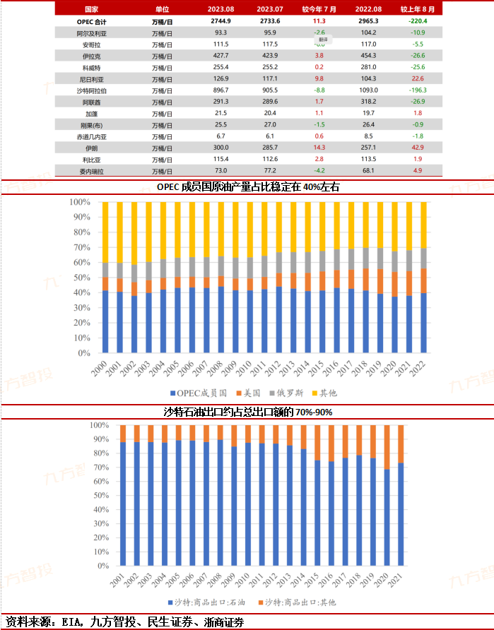 沙特原油产量约900万桶/日。历史上沙特的石油出口额约占其总出口额的70%-90%,国家经济与原油价格紧密相关。因此,将油价维持在合理水平符合OPEC国家的共同利益,历史上在油价跌幅较大时,为平衡供求关系,OPEC成员国也往往会一致减产,从而推动油价回归合理水平。沙特等主要产油国的财政收入高度依赖原油价格,若油价长期处于偏低位置,将会对国家的正常运转造成巨大影响,当油价偏离中枢水平的程度越大,就越可能通过减产来促进油价上行。但是,一方面,原油具有政治属性,历史上油价下跌时OPEC也不一定就会减产;另一方面,即便减产落地,原油供给向下拐点与原油价格向上拐点之间也会存在较长时滞,总结来说,在正常环境下,供给决策滞后于价格变化,而在政治属性主导的非正常环境下,供给端数据的公布同样会滞后于实际事件的发生。