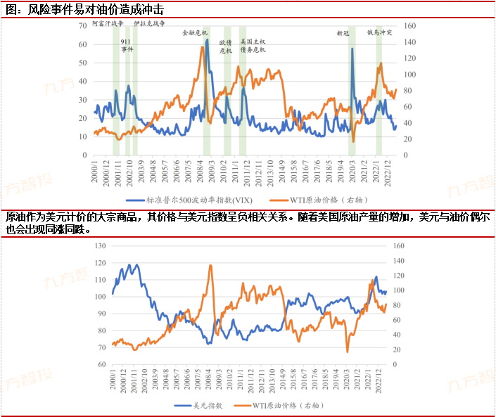 原油同时具备商品、交易、政治三重属性。原油首先是一类大宗商品,其价格走势会受到供需平衡关系的影响。其次,原油具备成熟的期货交易体系,这意味着投资者情绪等交易面因素也会对原油价格造成影响。此外,原油对现代工业意义重大,而全球原油产量集中在中东等地,这使得原油同时具备政治属性,历史上多次成为地缘政治博弈的工具。最后,从计价机制上,由于原油以美元作为计价货币,美元指数的涨跌也会对原油价格造成影响。当发生局部冲突等风险事件时,易对原油供需造成冲击,从而对油价产生影响。