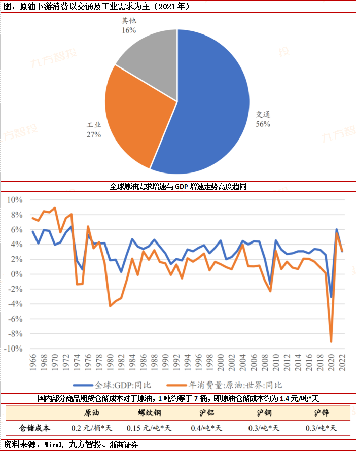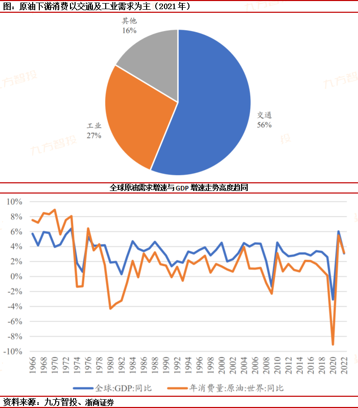 原油下游需求分布广泛,与全球总量经济景气度密切相关。根据OPEC统计数据,原油下游消费结构中以交通及工业需求为主,均与经济景气度关系密切。全球原油需求增速与全球GDP增速的走势高度一致,对原油需求的判断可归结为对全球经济景气度的判断。