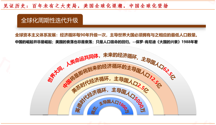 美国的全球化高潮已过,中国必须自己构建自己的全球化与人民币国际化。美国的人口体系已经无法享受到了资本主义全球化的红利,只有人口数量达到了全球人口20%以上的国家才有基础条件成为未来新一轮全球化的核心主导国。从这个角度看,全球能够争夺新一轮全球化的康波核心主导国的只有中国,印度,东盟,欧盟(未来需要继续扩大),可能的美洲联盟(美国主导美洲联盟)。中国在所有的竞争者中无疑处于优势起跑地位。