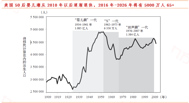 美国“婴儿潮”一代出生走势始自1934年,13年人口出生速度开始加快,在1961年达到顶峰,支出峰值晚于出生高峰46年,则预计在1983~2007年出现较强的经济繁荣。尽管在此过程中时常会有一些股市和房地产市场泡沫破灭造成的大幅摇摆,整体情况不也还是如预测这般。之前的“鲍勃·霍普”一代的出生高峰集中在1897~1924年,晚于此46年的经济繁荣在1942~1968年显现。之后,这一世代经历了由1969年持续到1982年的经济发展放缓。这不是短期情况的指示标,但却是史上最好的长期走势指示标。