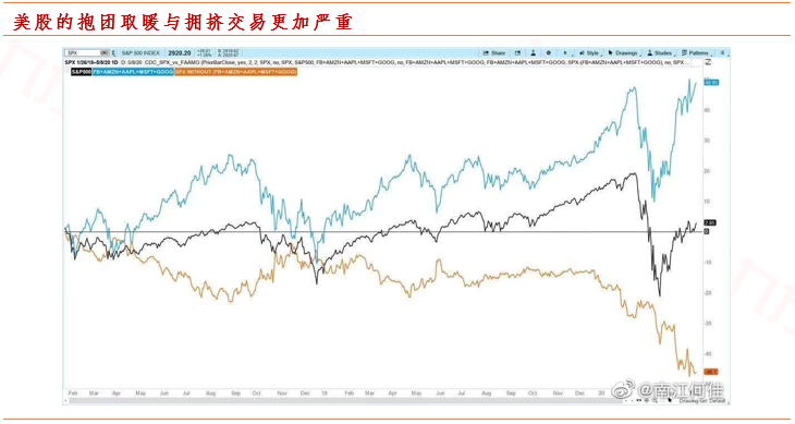 上图中,蓝线是美国5大科技股(脸书、亚马逊、微软、苹果、谷歌)组成的指数;黑线是标普500指数;黄线是剔除了5大科技股后的标普500指数。500家美股头部公司,只靠5家公司在“撑门面”,99%已经垮塌。