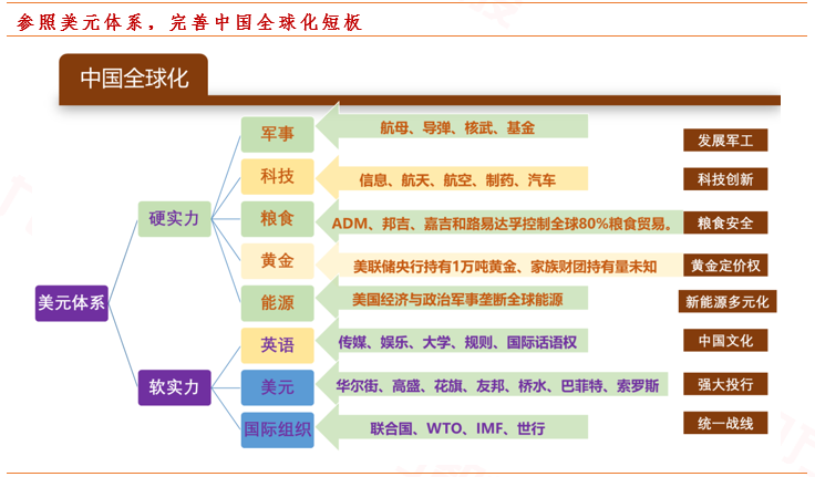 参考美元体系的建立过程,中国未来需要完善相应短板涉及行业:科技,军工、粮食,新能源,黄金,券商,传媒以及新老基建相关的板块。