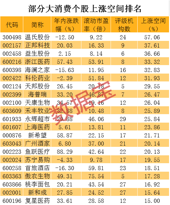 大消费方面,温氏股份上涨空间最高,24家机构一致预测目标价37.07元,较现价有57.06%上涨空间。此外,正邦科技、益生股份、浙江医药等个股上涨空间均超过30%。