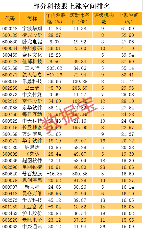 数据宝统计显示,最新市值百亿元以上、评级机构家数在5家以上且一致目标上涨空间15%的科技股,有31只。其中,9家机构一致预测宁波华翔目标价27.59元,较现价有61.09%的上涨空间。此外,捷成股份、卧龙电驱、神州数码等个股上涨空间均超过40%。