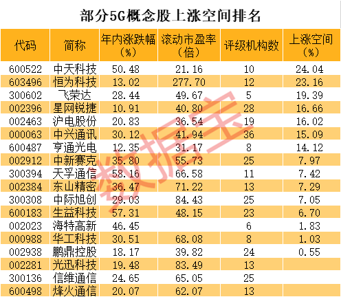 数据宝统计显示,5G概念股中,上涨空间最大的是中天科技,10家机构一致预测目标价近15元,较现价有超20%的上涨空间。此外,恒为科技、飞荣达、星网锐捷、沪电股份等个股上涨空间均超过15%。