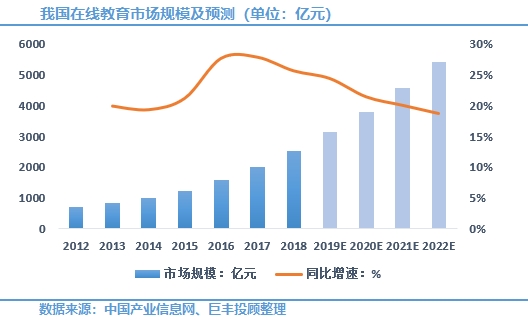 关于在线教育市场规模方面,据中国产业信息网显示,2018年行业规模约为2517.6亿元,同比增速25.7%左右,预计未来3到5年间还将保持在16~24%左右的增速,市场整体增长势头有望保持稳定。