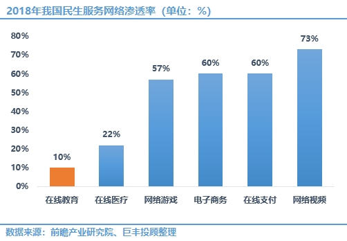 随着在线教育市场高速增长,行业的渗透率也是连续提升。但是相比其它民生服务类的网络渗透率,例如网络视频(72%)、电商(60%)和在线支付(60%)等领域,在线教育仍处在低位水平,2018年在线教育渗透率的录得数据仅为10%。这说明我国在线教育的渗透率还有很大提升空间。