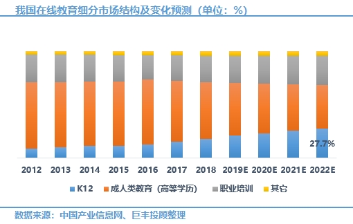 在新一代80、90后父母中,教育意识升级明显,且消费能力也有所提高。同时,新一代的00后、10后的孩子对互联网的熟悉程度拥有先天优势,配合近年国家二胎政策催生的新生人口红利,K12(学前至高中教育,现在普遍代指基础教育)在线教育的接受度和市场规模也开始呈现出快速增长,预计2020年K12教育在整个在线教育行业中的占比有望提升到27.7%左右,也是一个值得关注的细分领域。