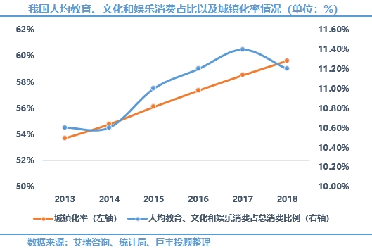我国人均可支配收入不断增加,且教育文化娱乐支出占总消费支出呈现整体上升趋势。