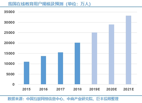 受益于我国互联网的快速发展,在线教育行业也于2011年后来迎来快速增长期。数据显示,截至2019年上半年,我国在线教育用户规模已达2.32亿人,较2018年底增长3122万人,占整体网民总数的27.2%。其中手机在线教育用户规模达1.99亿,是在线教育的主要群体。据研究机构预测,在线教育用户未来3到5年内仍会将保持14%~21%的高速成长,预计在2020年后,在线教育用户有望突破3万亿人。