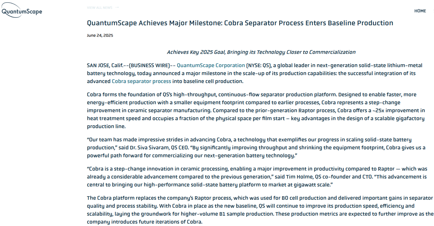 事件:美国固态电池企业Quantum Scape(QS)宣布,其先进的Cobra隔膜工艺已成功集成到基线电池生产中,标志着公司生产能力规模化迈出了重要一步。