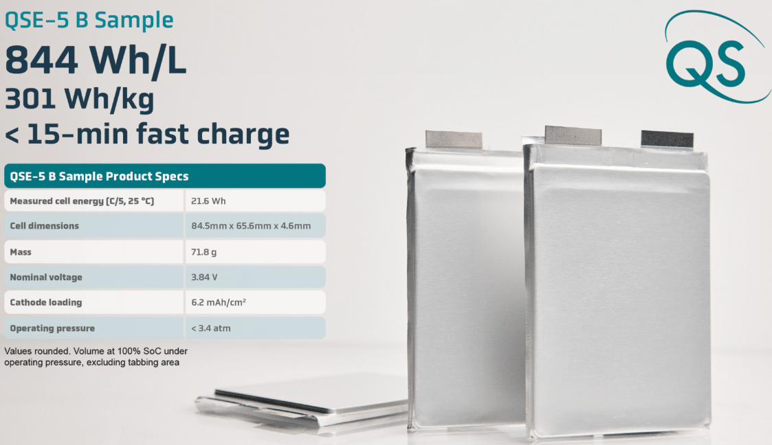 在产品层面,QS的QSE-5B样固态电芯已于近期进入小批量生产,并向部分汽车客户交付。该电芯容量为5Ah,能量密度达844Wh/L或301Wh/kg,具备10C放电能力,在45°C下可于12至15分钟内完成10%至80%的快速充电,且在-30°C环境下仍可正常工作。