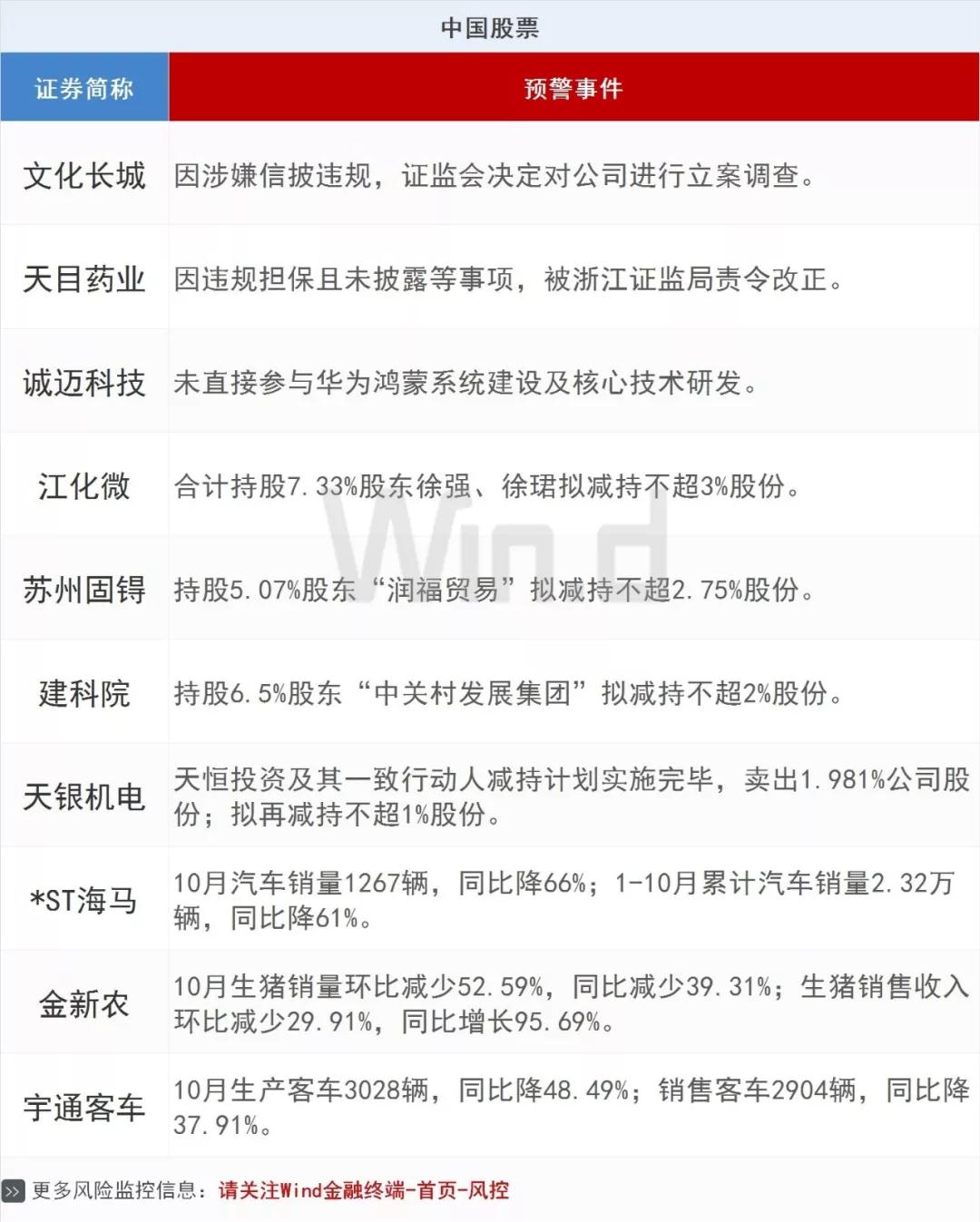 每日投资预警 | 证监会决定对文化长城进行立案调查!