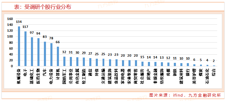 从行业分布来看,本期机械设备行业调研量继续居首,有134家上市公司接受调研;随后为电子行业,有117家上市公司接受调研。机械设备行业中,流通市值500亿以上的大盘股主要包括中国中车、汇川技术、徐工机械、中国通号、中联重科、中控技术、豪迈科技、罗博特科等,市场回归普涨风格。