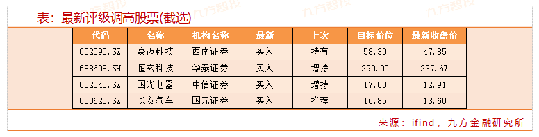 近5日有23家公司获得券商调高评级,豪迈科技、恒玄科技、国光电器、长安汽车获券商给出明确目标价格。