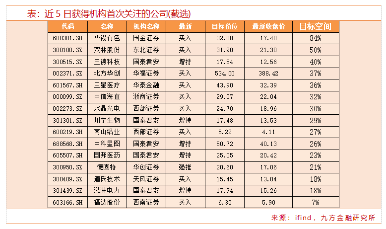 最新机构首次关注股票方面,近5日共有50份研报对上市公司进行首次覆盖。其中,15家获得明确的目标价格。
