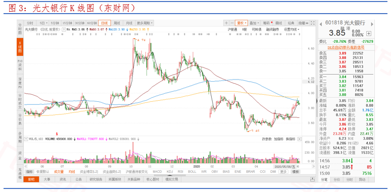 不良率继续改善,资本充足率微降:光大银行3月末不良贷款率、拨备覆盖率分别为1.55%、182%,季度环比-1bp、+1pct。公司2019年即收紧信用卡等消费类贷款的投放,个人贷款占比下降,预计消费贷款资产质量受疫情影响相对较小。Q1单季年化信贷成本环比下降25bp至2.07%,同比-2bp:Q1单季年化不良贷款生成率环比-39bp至1.70%,同比持平,不良生成压力不大,信用风险处于可控区间。3月末三级资本充足率分别为13.10%、10.83%、9.05%,季度环比-37bp、-25bp、-15bp,加大资产投放力度对资本的占用增加;