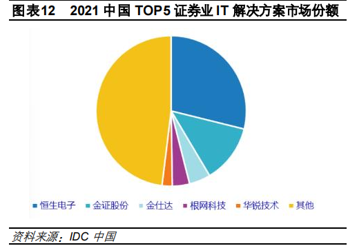 由于交易系统、运营系统等产品必须保持安全、稳定,券商等金融机构对于选择和更换供应商较为慎重,因此证券IT业务客户粘性较高,行业龙头效应显著。据IDC中国统计,2021年恒生电子、金证股份核心交易系统市场份额排名前2,排名前5的服务商合计占据绝大部分市场。