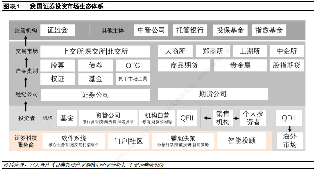 证券投资市场主要由投资者、经纪公司、交易所、监管机构、证券科技服务商组成。其中,证券科技服务商作为国内证券投资市场生态体系的重要组成部分,参与者较多,提供交易系统、行情系统、金融数据、财经门户等多类服务。