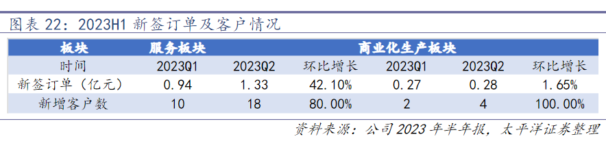 公司新签及在手订单充沛、活跃客户广泛,保障未来业绩高速发展,近年来不断加大市场营销及客户开拓力度,客户数量进一步提升,新签及在手订单快速增长。截至2022年底,公司在手订单为3.65亿,同比增长54.22%,活跃客户数量为267人,同比增长32.84%。在客户及订单层面取得积极进展,服务板块2023二季度新签订单为1.33亿元,比2023一季度环比提升42.10%,新增客户数为18家,环比提升80%。