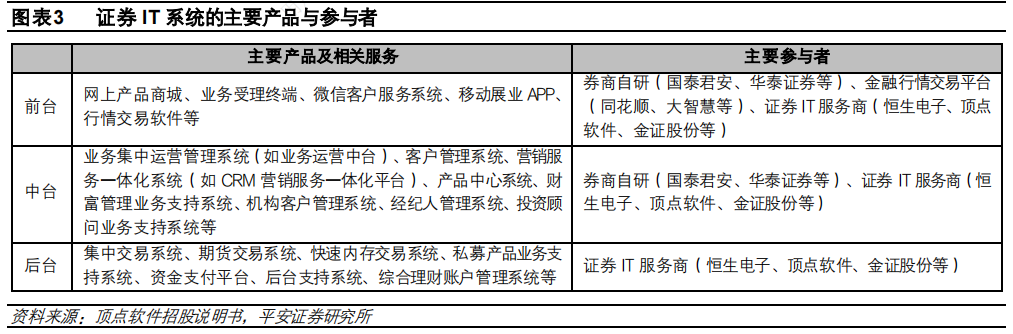 从主要产品和参与者分类来看,证券IT服务主要分为前台、中台和后台三类系统软件服务。前台系统主要为服务渠道和业务支持,与证券投资者交互。中台系统主要为运营与服务支持,将业务流程实现线上化。后台系统主要是交易系统、清算系统等业务基础系统,是证券IT服务的核心系统。