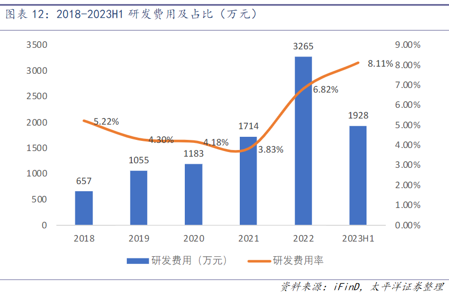 AI等核心技术助力新药研发,研发投入不断加大,研发费用随着营收规模的扩大快速增长,从2018年的657万元快速增长至2021年3265万元,2023上半年为1928万元;研发费用率也不断提升,从2018年的5.22%快速提升至2022年的6.82%,2023上半年为8.11%。