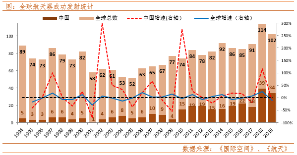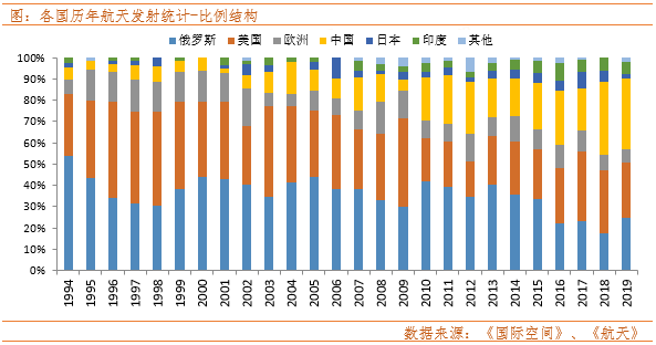 回顾历史,除了技术层面上取得了质的巨大进步外,中国航天的量变同样成绩斐然。静态来看,中国已经是毋庸置疑的航天大国。据统计,1994年以来的全球航天器成功发射共计2002次;其中,中国的发射次数超过欧洲,仅次于俄罗斯与美国。同时,阶段增速数据显示,中国航天发射次数的年均增速一直在主要航天大国中遥遥领先,并且呈现出明显的加速趋势。