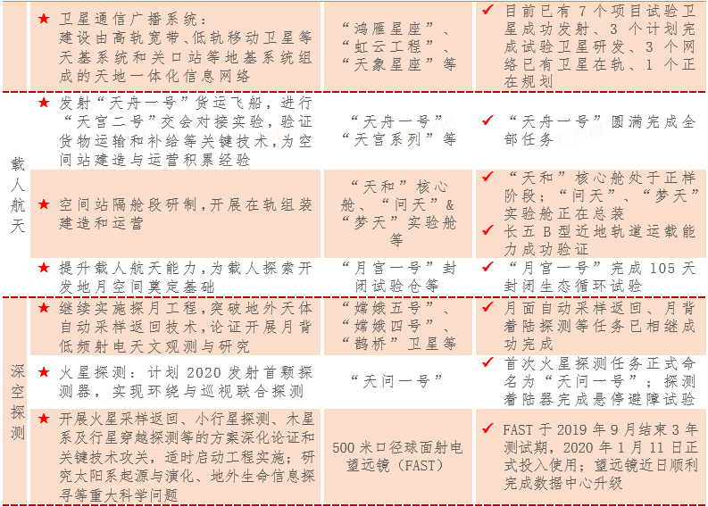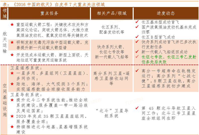 依照顶层规划,航天领域的发展很可能将在近期迎来新一轮高潮。国务院新闻办公室2016年12月27日发布的《2016中国的航天》白皮书明确指出,“未来五年,中国将加快航天强国建设步伐,持续提升航天工业基础能力,加强关键技术攻关和前沿技术研究,继续实施载人航天、月球探测、北斗卫星导航系统、高分辨率对地观测系统、新一代运载火箭等重大工程,启动实施一批新的重大科技项目和重大工程,基本建成空间基础设施体系,拓展空间应用深度和广度,深入开展空间科学研究,推动空间科学、空间技术、空间应用全面发展”。换言之,到2021年底,中国航天的主要发展任务将聚焦航天运输系统、空间基础设施、载人航天及深空探测等10大领域、约30个细分方向。