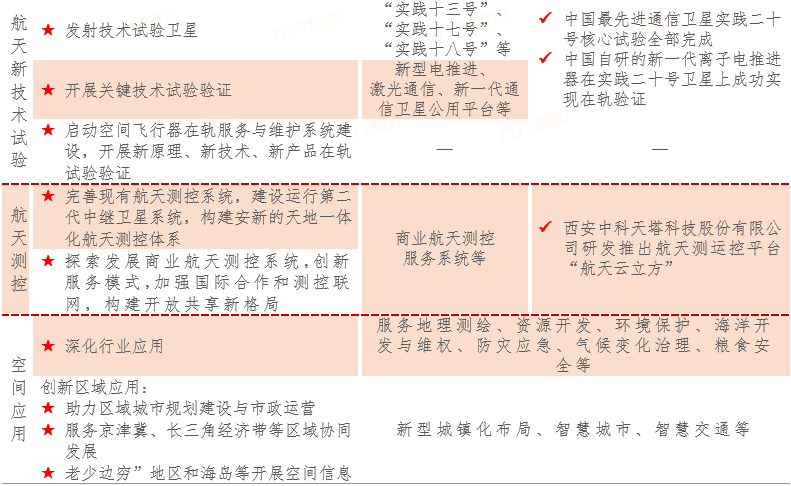 其三,服务体系等配套软件系统的商业化探索或有望加速。总体上,7大任务中侧重软件服务应用的“空间应用”似乎具有最为广阔的市场与政策前景。从应用端来看,空间应用的三个重点方向都能承接航天基础设施与具体市场需求。而且,在政策面上,相关的应用场景也与精准扶贫攻坚、建设美好生活以及助力地区经济建设等核心政策高度契合。换言之,以软件应用为代表的航天服务体系商业化有望迎来多元利好共振。