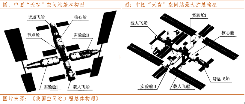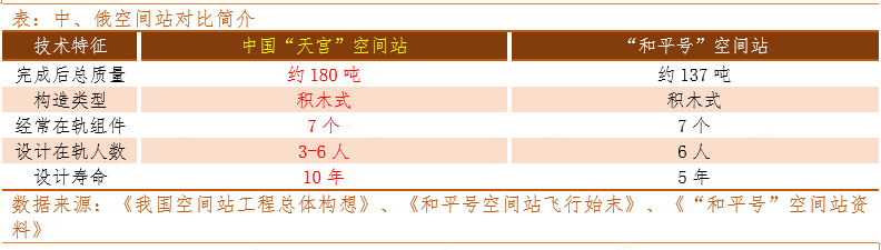 其次,鉴于国产空间站的结构等特点,空间站的实际建设使用周期可能长于预期。根据中国载人航天工程总设计师发表的期刊文章,在空间站的总体结构上,中国空间站将采用水平对称T形构型作为三舱组(核心舱、实验舱I/II)合体基本拓扑结构;在经过扩展后,空间站最终将包括1个核心舱、2个科学实验舱、4舱外暴露实验平台。总体来看,中国空间站在结构等方面与曾经的俄罗斯“和平号”十分类似;参考“和平号”的建设运营经验,中国“天宫”的建设维护周期或比计划时间更长,而且空间站的实际使用寿命可能远超预期。