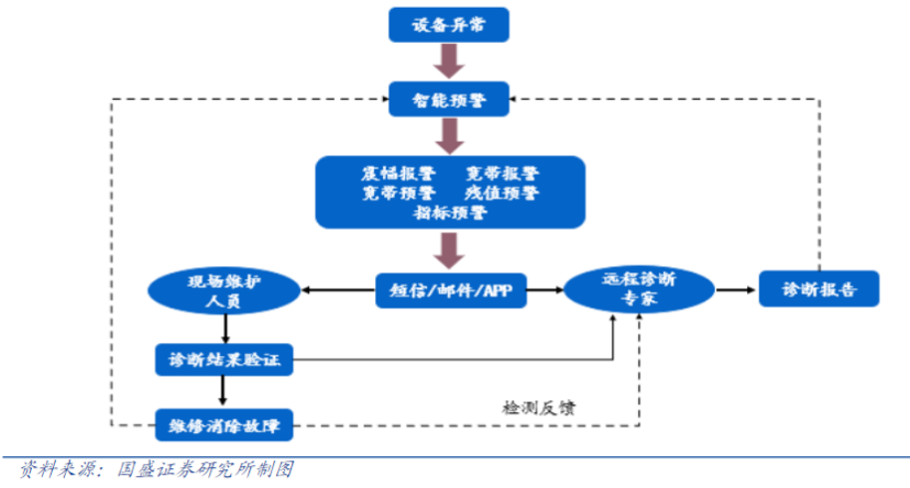 其中核心工作原理是以传感器收集物理信号,智能算法进行实时监测和障预诊断。公司自主开发的传感器可用于收集振动、温度、位移、冲击等物理量,通过有线或无线设备向上传递至服务器,利用智能算法对其进行处理,从而完成障预预警和设备状态分析。
